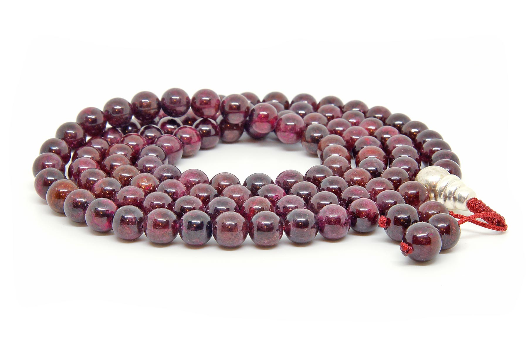 Классические буддийские четки из граната. Форма бусин — шар 8 мм. Гуру-бусина (металл) — шар 11 мм. Четки собраны из 108 бусин на прочном синтетическом шнуре и зафиксированы скользящим узлом.