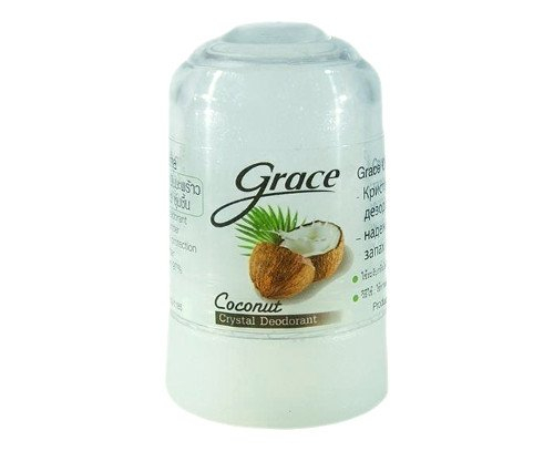 Дезодорант-кристалл тайского бренда Grace с экстрактом кокоса отлично справляется с неприятным запахом пота, блокируя его на весь день. Средство на все 100% состоит из натуральных компонентов — квасцов аммония и экстракта кокоса.