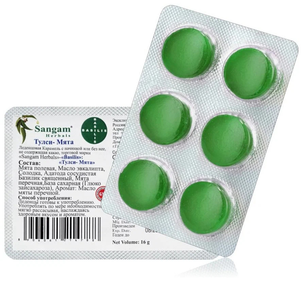 Леденцы Тулси и Мята Sangam Herbals, 1 блистер