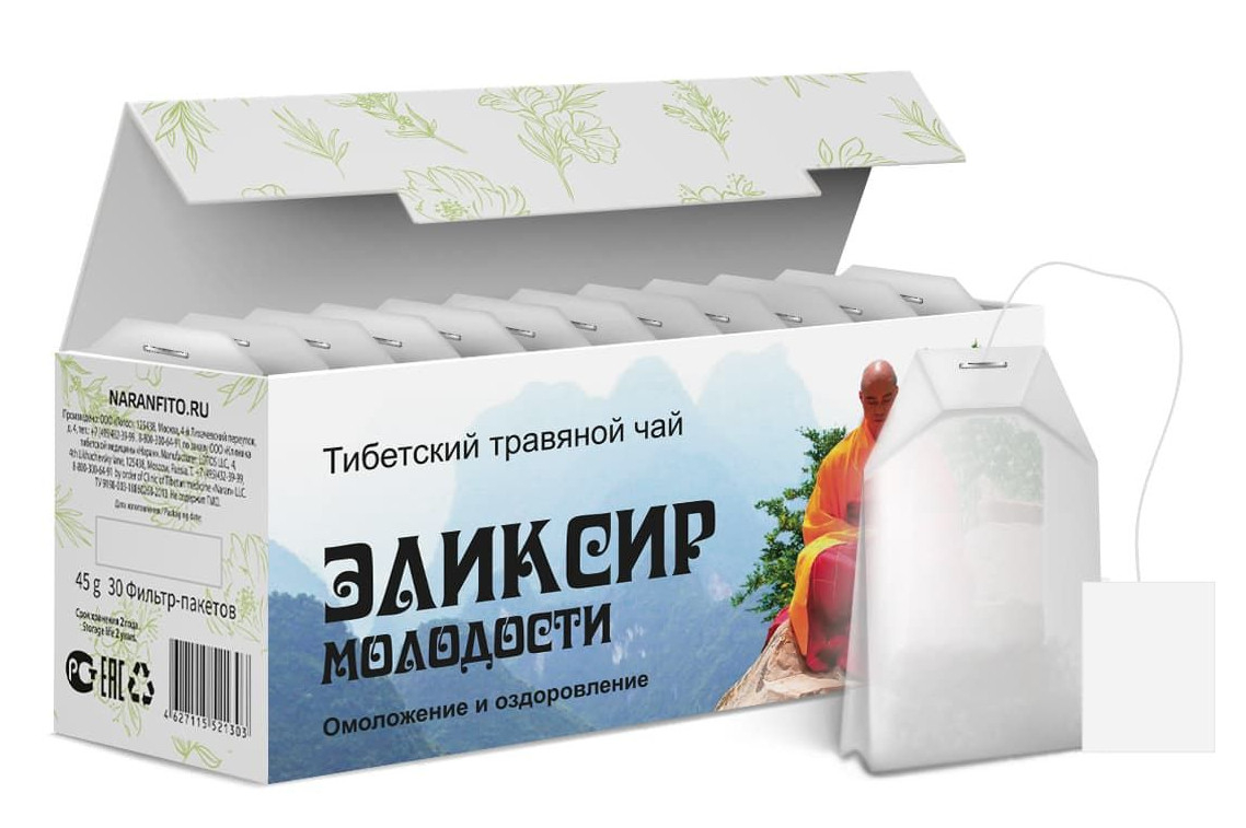 В тибетском чае «Эликсир молодости» собраны природные антиоксиданты, такие как бессмертник, ромашка, зверобой, березовые почки, которые обеспечивают защиту клеток от свободных радикалов, содержат минералы и витамины, необходимые для очищения организма, способствуют выведению токсинов, улучшению обмена веществ, обладают противовоспалительным эффектом, замечательным общеукрепляющим и омолаживающим эффектом, стимулируют регенерацию тканей и процесс обновления кожи.